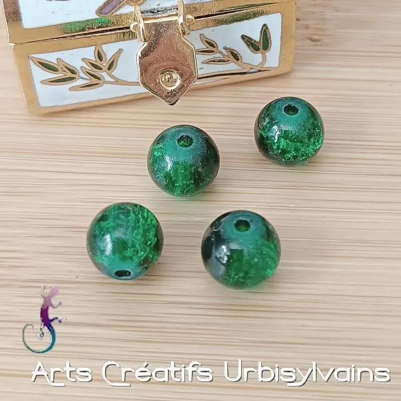 Jolies perles en verre craquelé de couleur verte.