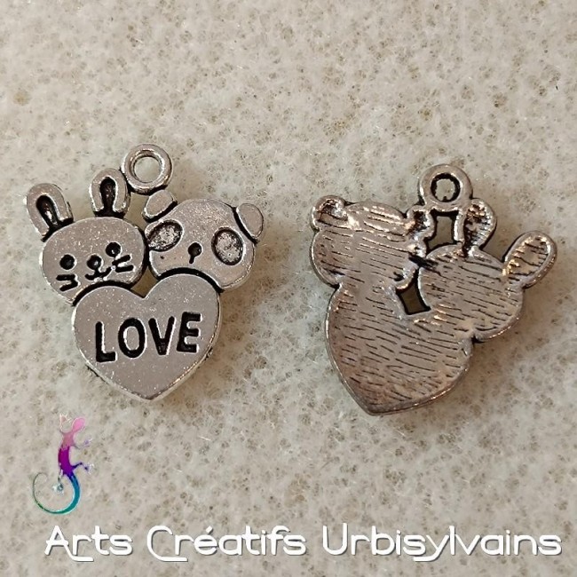 Breloques love lapin et panda en métal argenté antique.