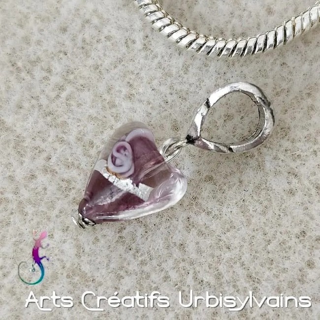 Bélière ciselée en métal argenté antique et perle coeur en verre murano rose foncé avec fil d'argent pour bracelet et collier européen.