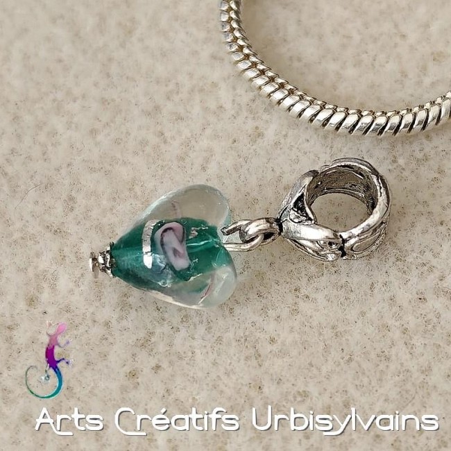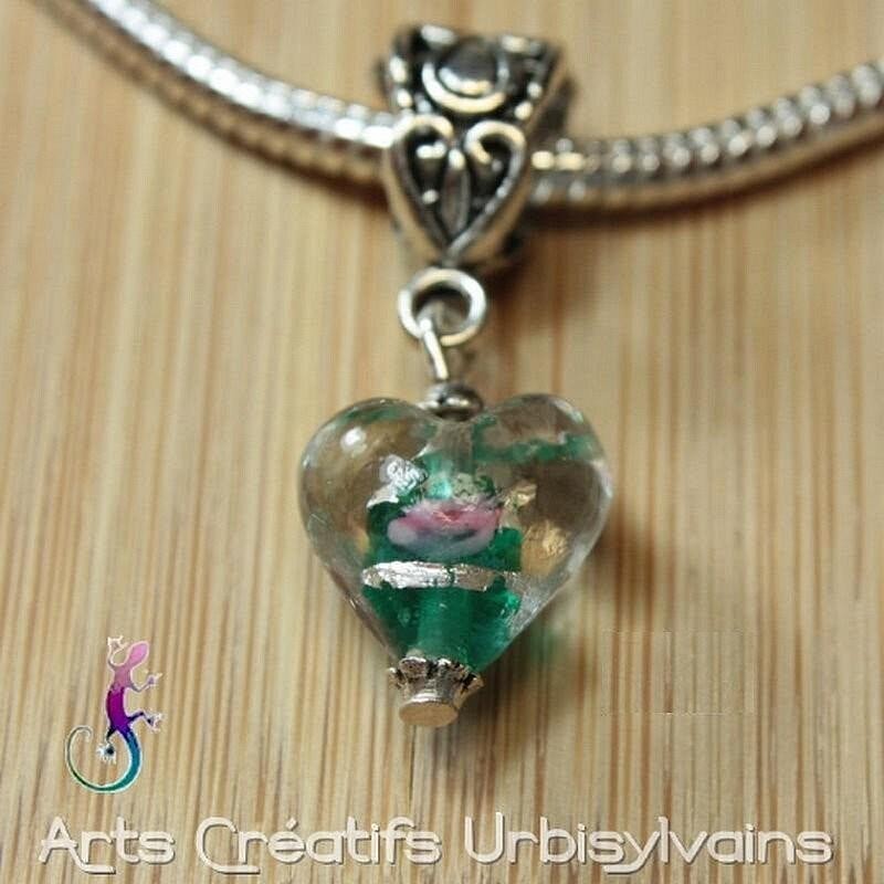 Bélière ciselée en métal argenté antique et perle coeur en verre murano vert foncé avec fil d'argent pour bracelet ou collier européen.