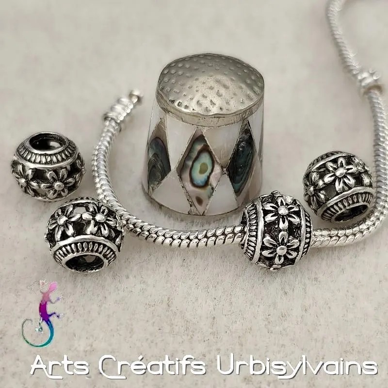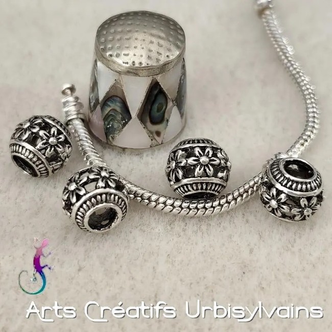 Perle européenne ronde ajourée en métal argenté pour bracelet ou collier européen.