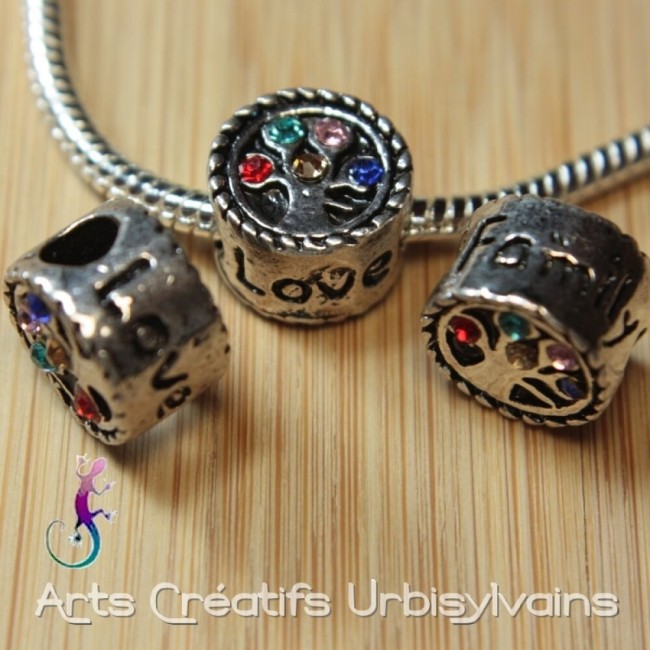 Perle arbre de vie en métal argenté et strass multicolores pour bracelet ou collier européen.