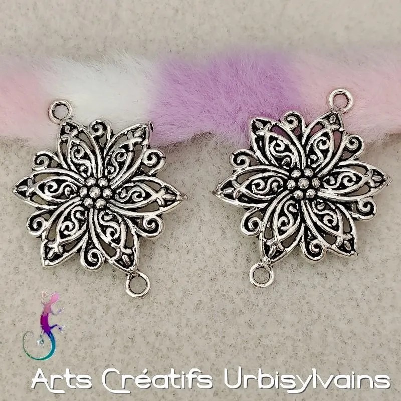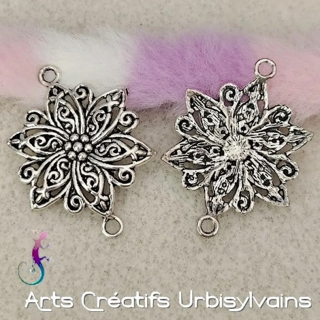 Connecteurs intercalaires fleur ouvragée en métal argenté antique.