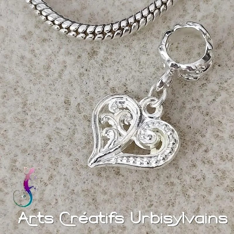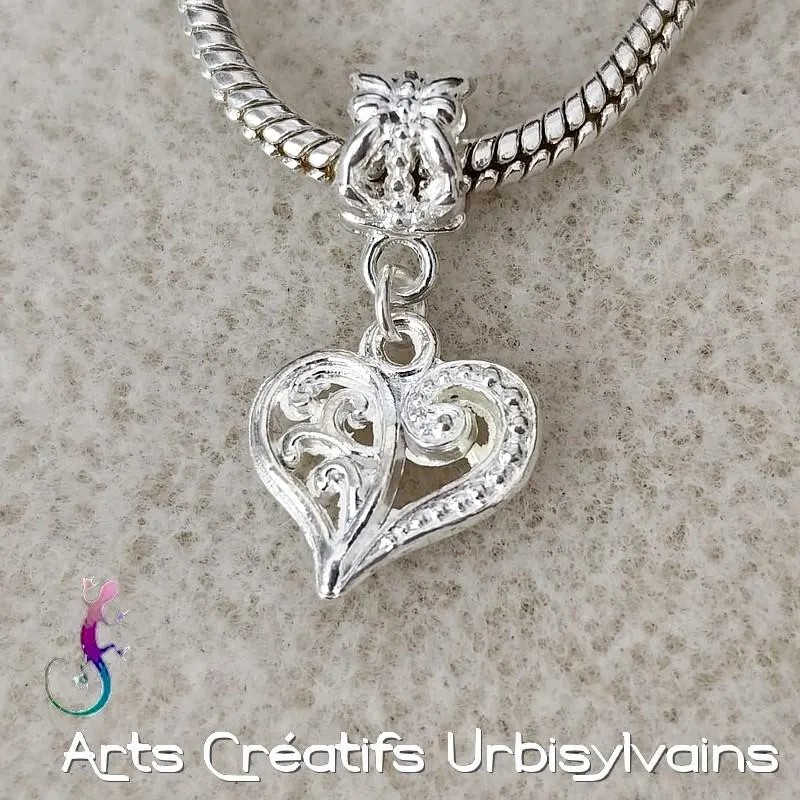 Pendentif avec bélière ciselée en métal plaqué argent et perle coeur en métal plaqué argent.