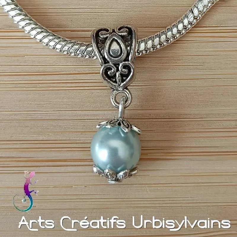 Bélière ciselée en métal argenté antique et perle renaissance nacrée bleue pour bracelet ou collier européen.