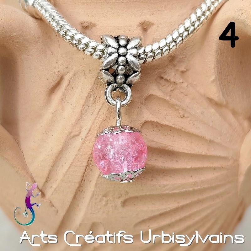 Bélières en métal argenté antique et perles en verre craquelé rose pour bracelet ou collier européen.