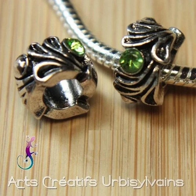Perle ouvragée en métal argenté et strass vert pour bracelet ou collier européen.