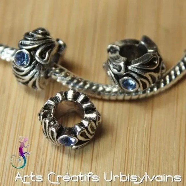 Perle ouvragée en métal argenté et strass bleu pour bracelet ou collier européen.