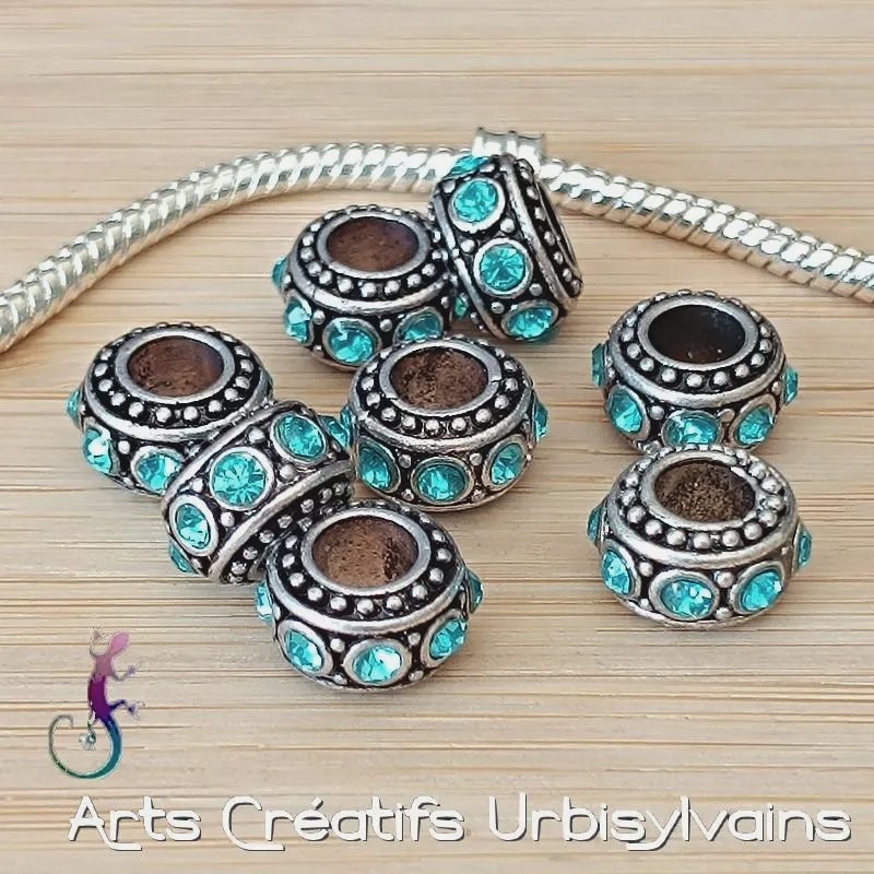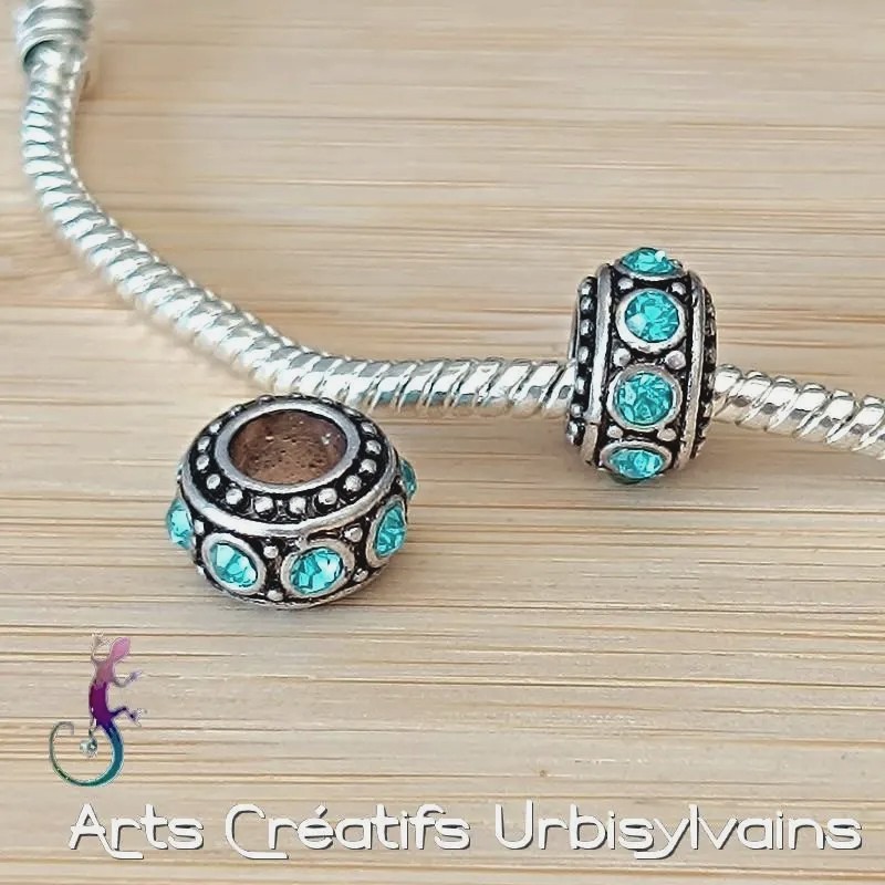 Perles en métal argenté en forme de rondelles avec strass turquoise pour bracelet ou collier européen.