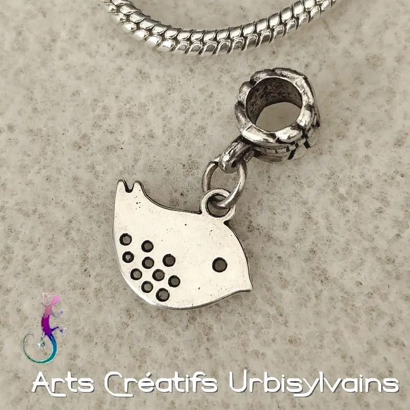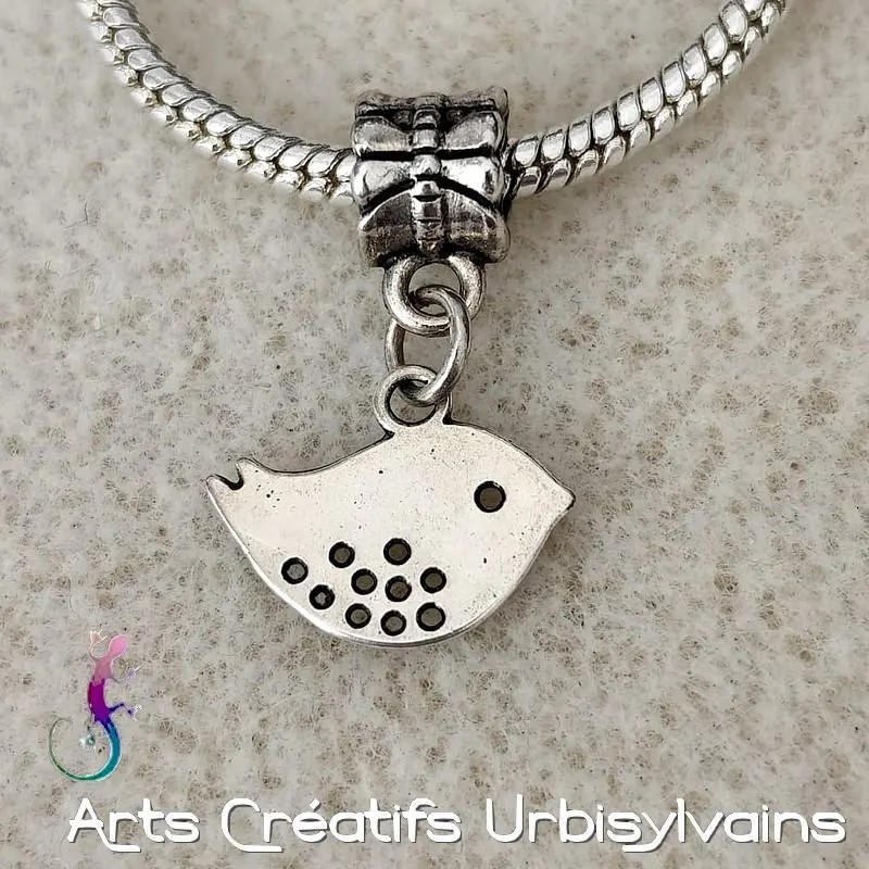 Bélière ciselée en métal argenté antique et breloque oiseau en métal argenté pour bracelet ou collier européen.