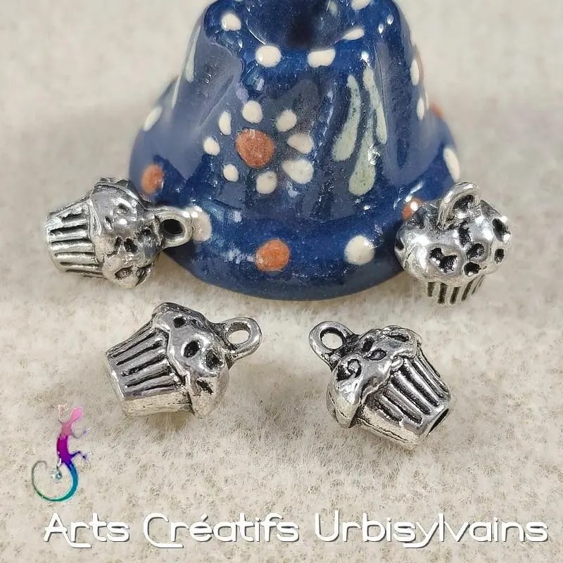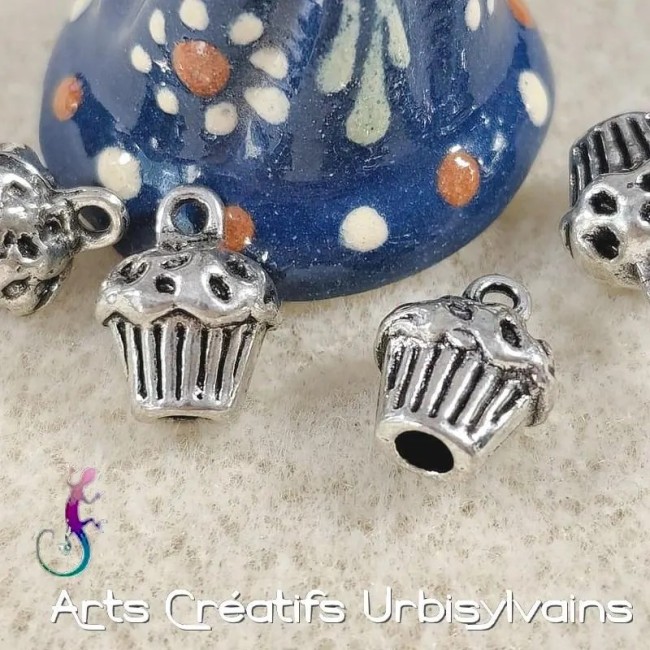 Breloque en forme de muffin ou cupcake 3D en métal argenté.
