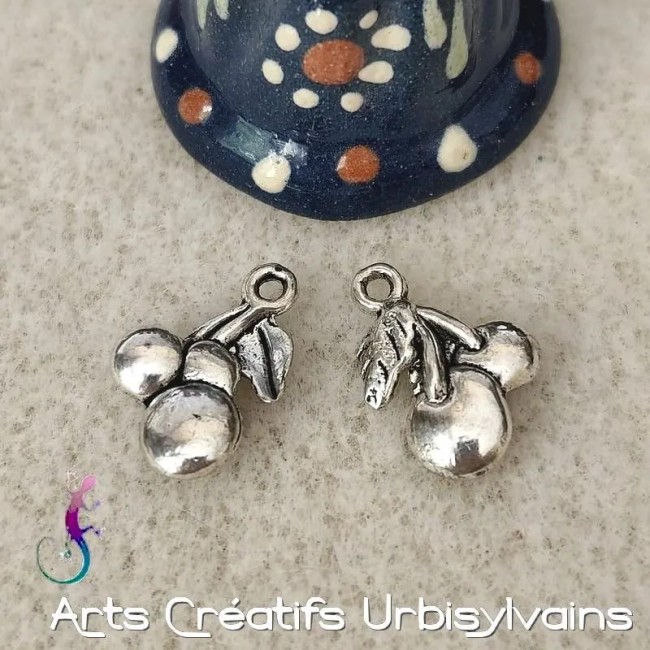 Jolis pendentifs en forme de cerises en métal argenté antique.