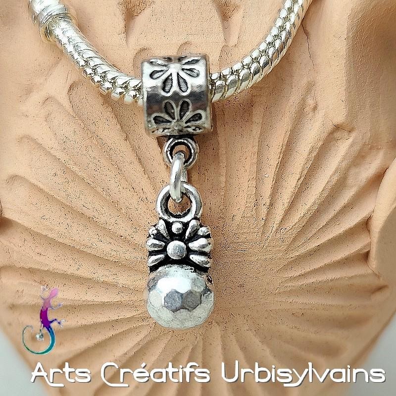 Bélière ciselée en métal argenté antique et pendentif boule à facettes en métal argenté antique.