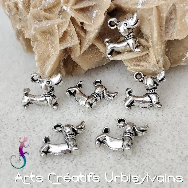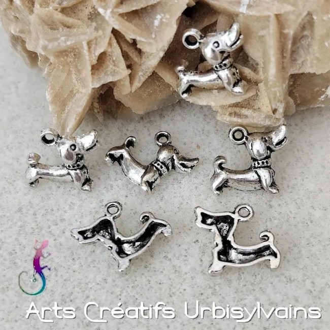 Breloques chien en métal argenté antique.