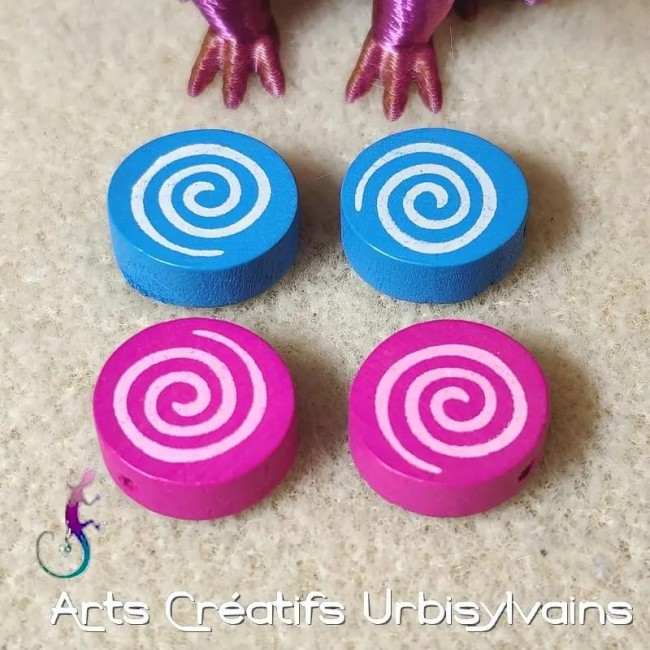 Perles en bois percées motif spirale en mélange de couleurs. Couleurs aléatoires.