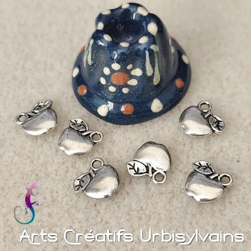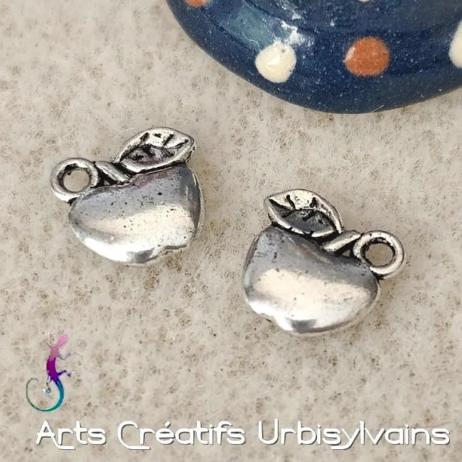 Breloques pomme fruit en métal argenté antique.