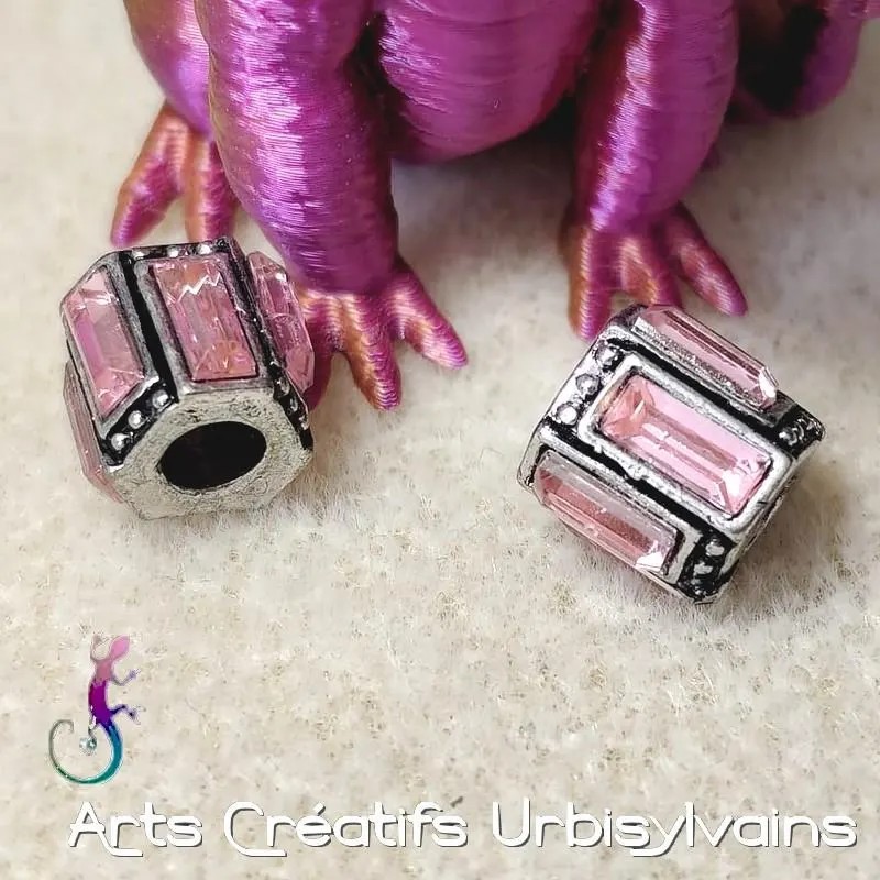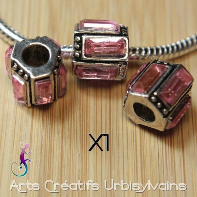 Perle vintage en métal argenté et cristaux roses pour bracelet ou collier européen.