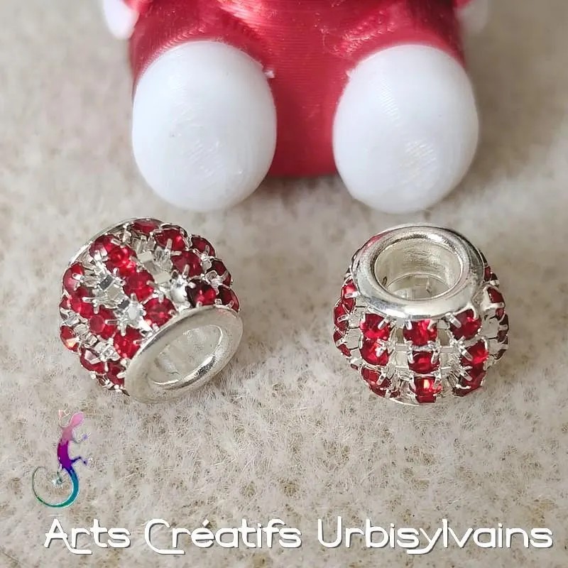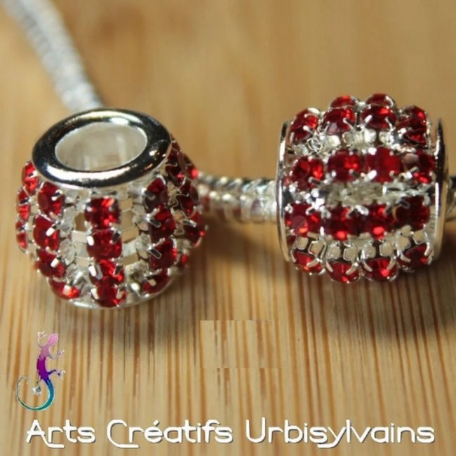 Perle en métal plaqué argent avec strass rouges pour bracelet ou collier européen.