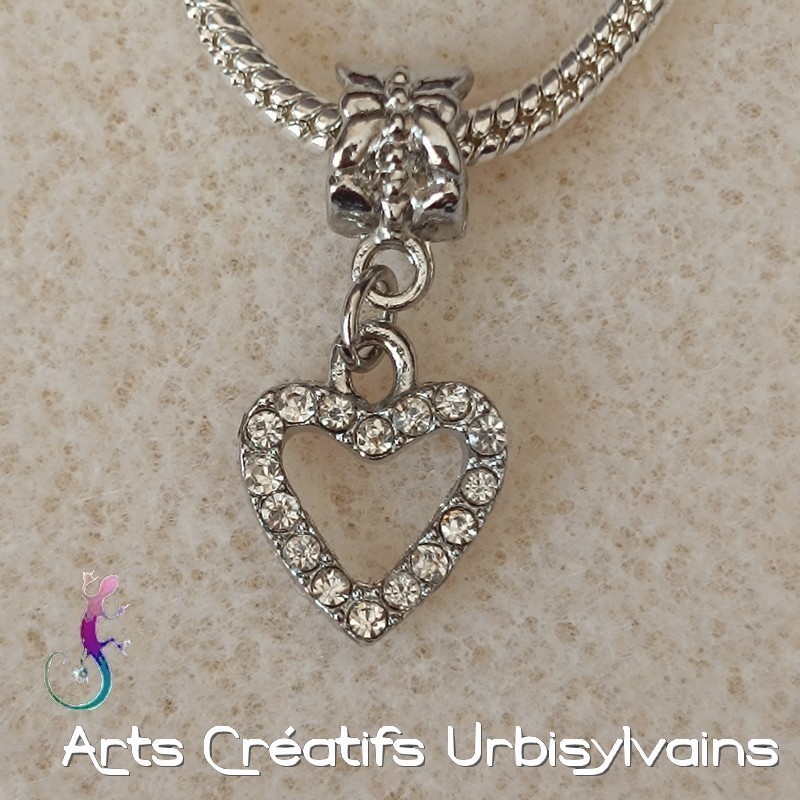 Bélière en métal argenté et pendentif cœur avec cristal blanc pour bracelet ou collier européen.