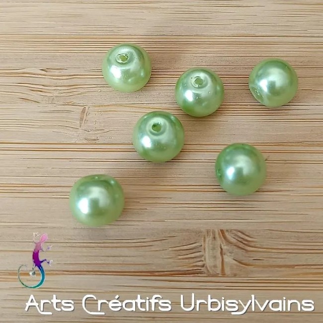 Jolie couleur verte pour ces perles rondes en verre nacré de type renaissance.