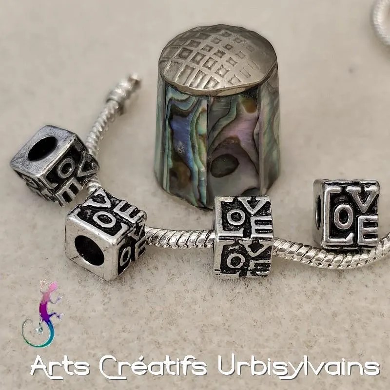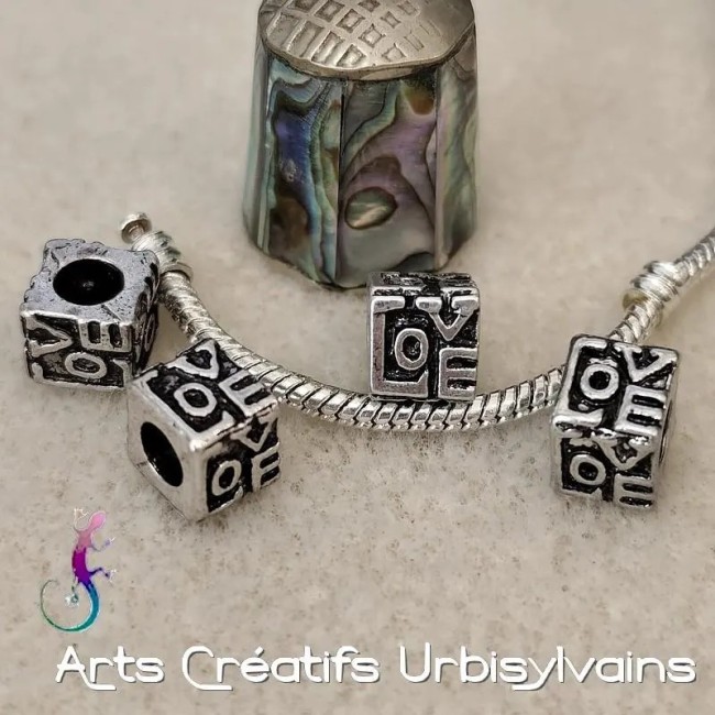 Perles cube "Love" en métal argenté pour bracelet ou collier européen.