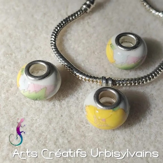 Perles en céramique décor fleurs jaunes pour bracelet ou collier européen.