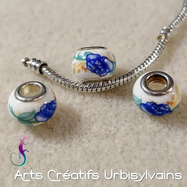 Perle en céramique décor fleurs et feuilles vert, bleu et blanc pour bracelet ou collier européen.