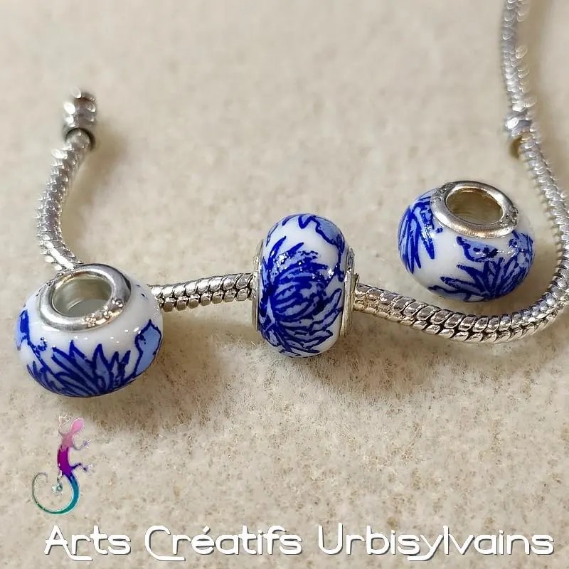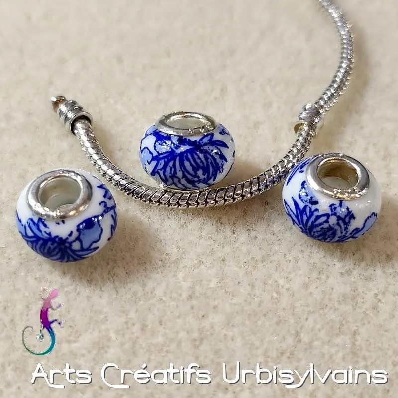 Perle européenne en céramique décor fleurs bleu et blanc pour bracelet ou collier.