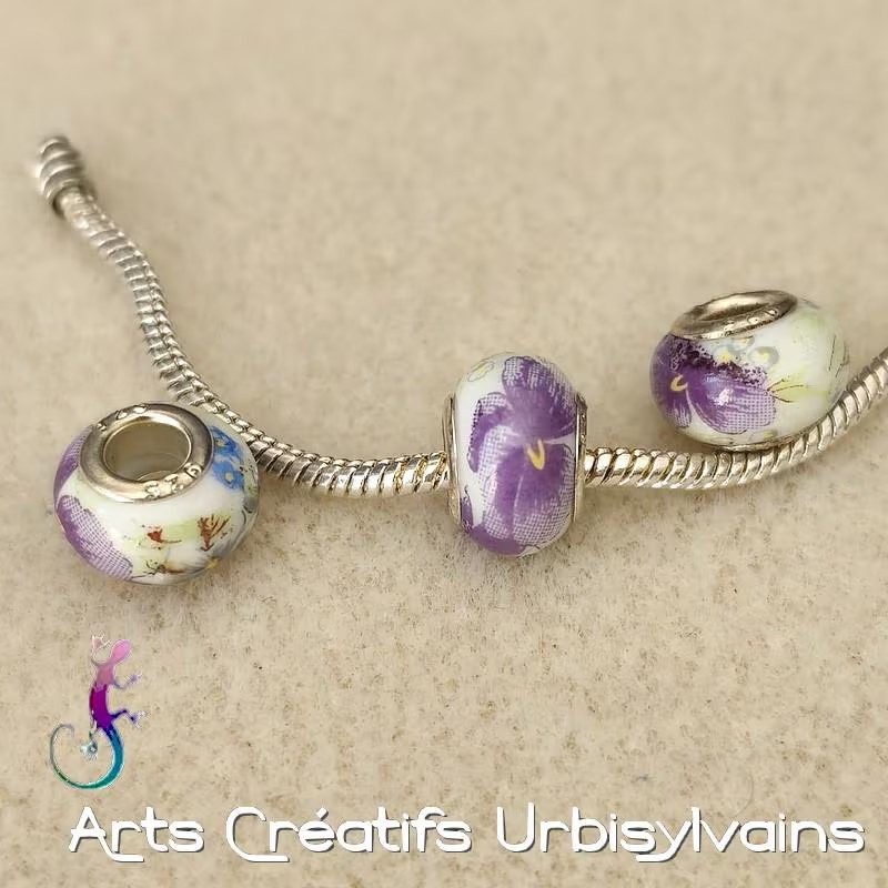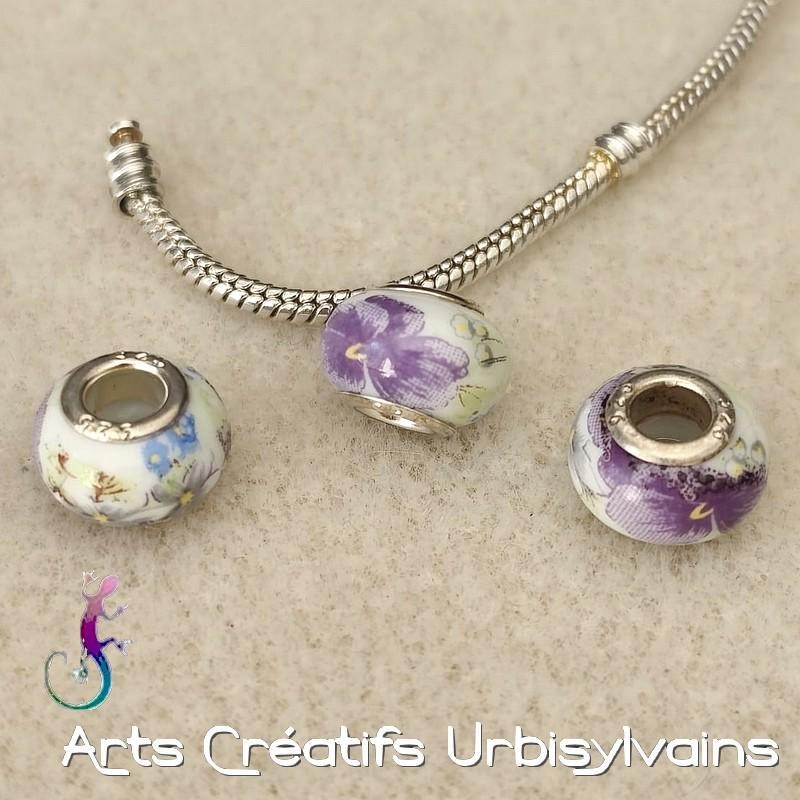 Perles en céramique décor fleurs mauves pour bracelet ou collier européen.