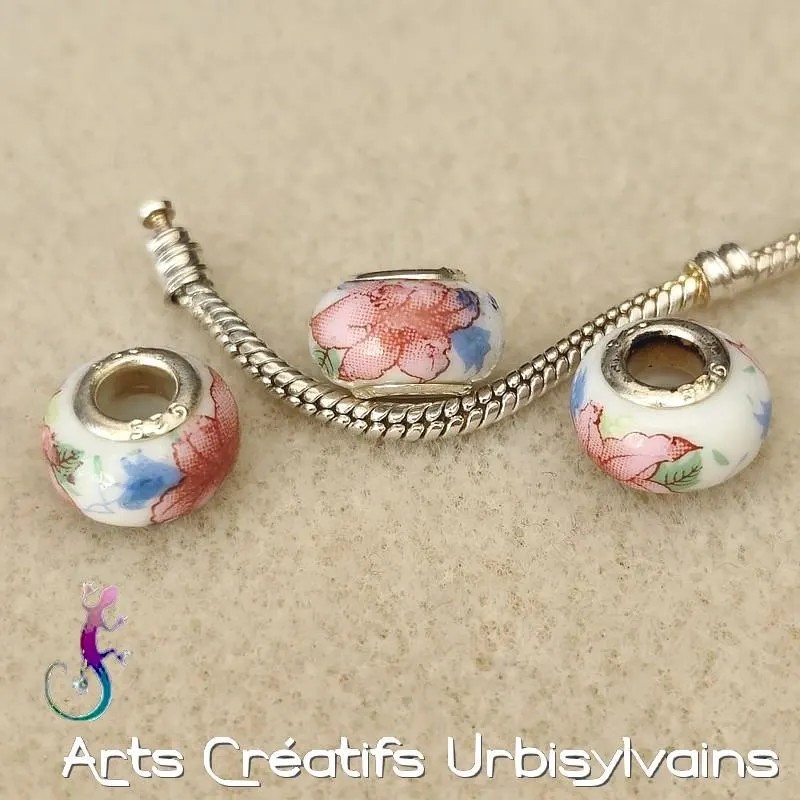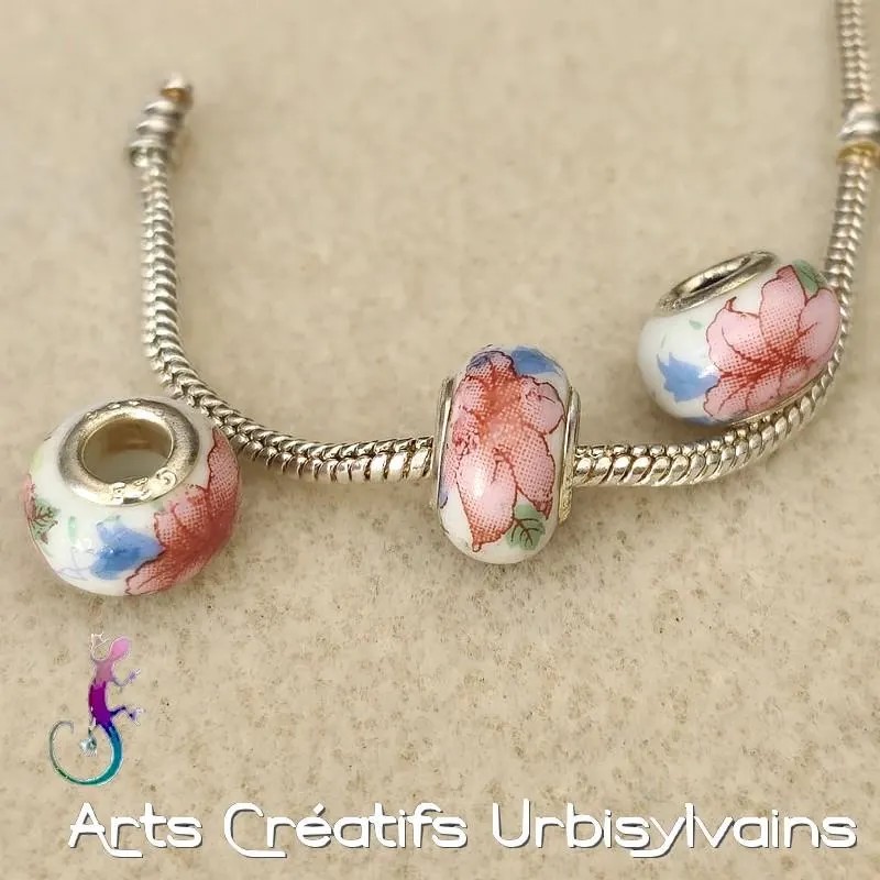 Perles en céramique décor fleurs roses pour bracelet ou collier européen.