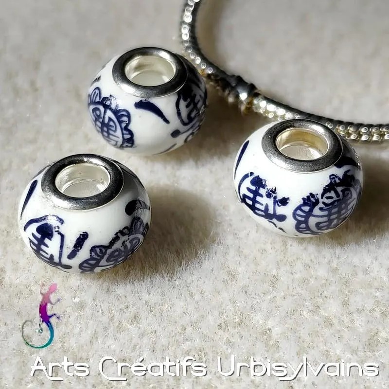 Perle européenne en céramique décor chinois bleu pour bracelet ou collier.
