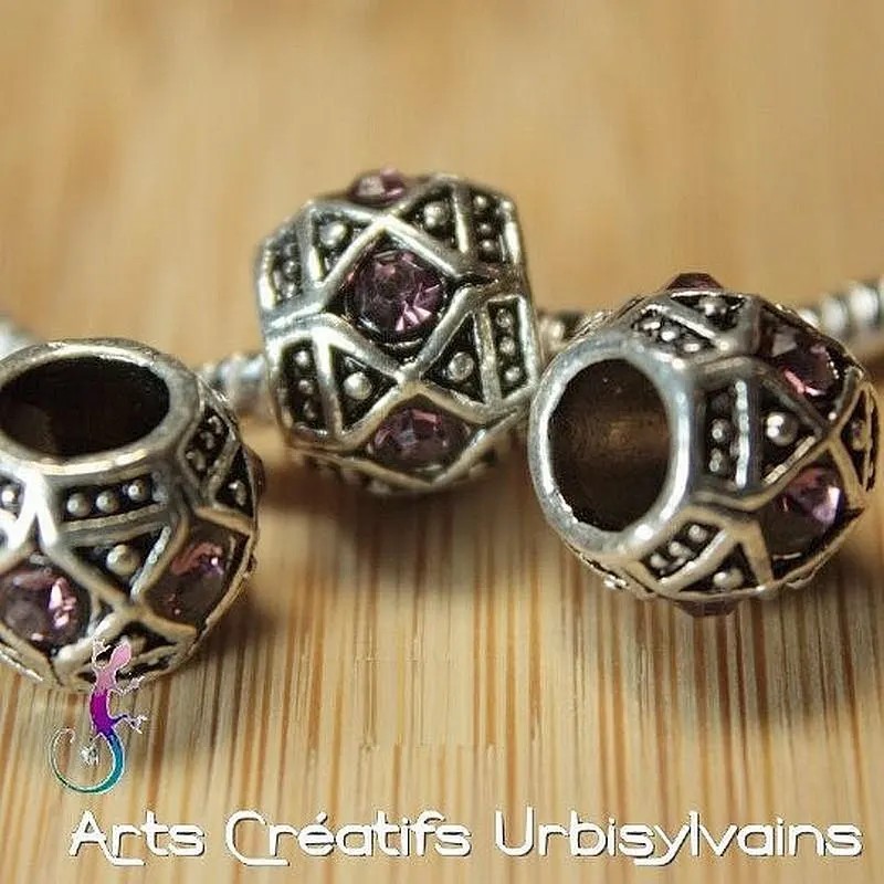 Perle en métal argenté avec strass vieux rose pour bracelet ou collier européen.