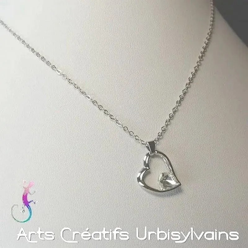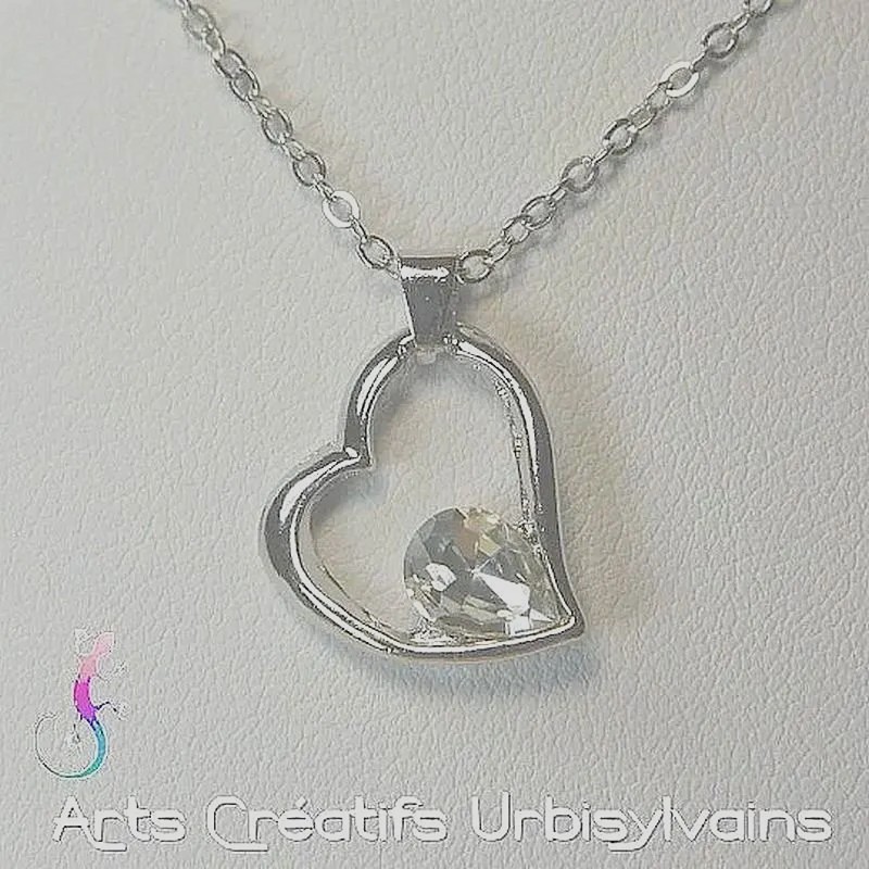 Chaîne et pendentif cœur en métal argenté avec goutte en cristal blanc.