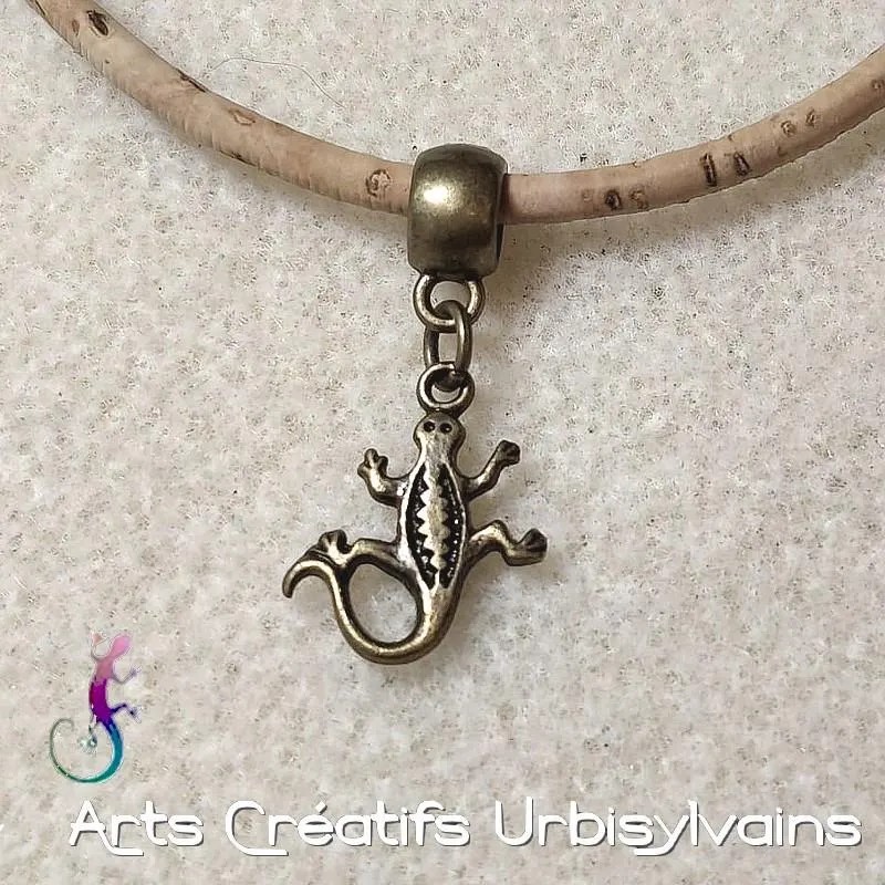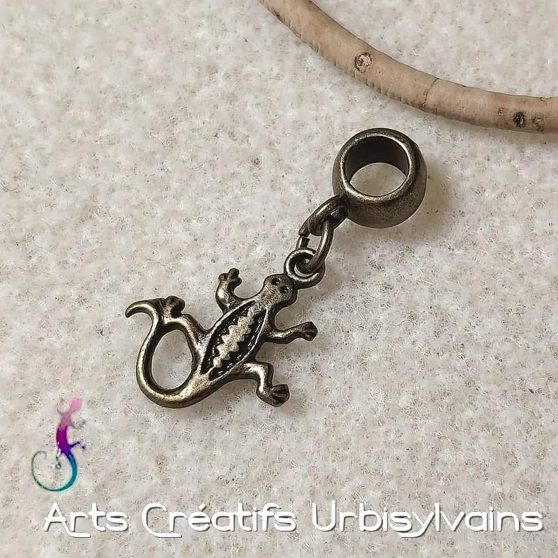 Bélière en métal couleur bronze et breloque gecko couleur bronze pour bracelet ou collier européen.