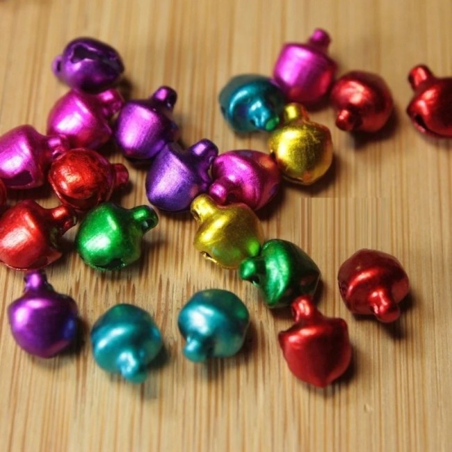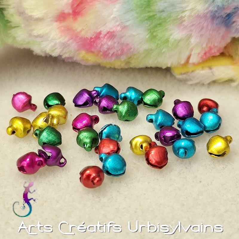 Grelots en métal multicolore pour fabrication de bijoux ou décoration d'objets divers.