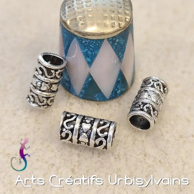 Perle tube ouvragé en métal argenté pour bracelet ou collier européen.