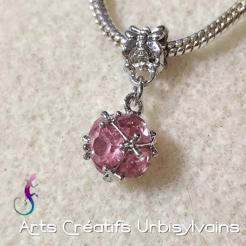 Superbe bélière ciselée en métal argenté et pendentif en cristaux roses.