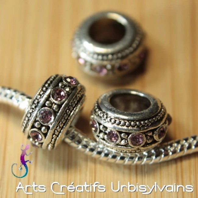 Perle en métal argent antique avec cristal rose pour bracelet ou collier européen.