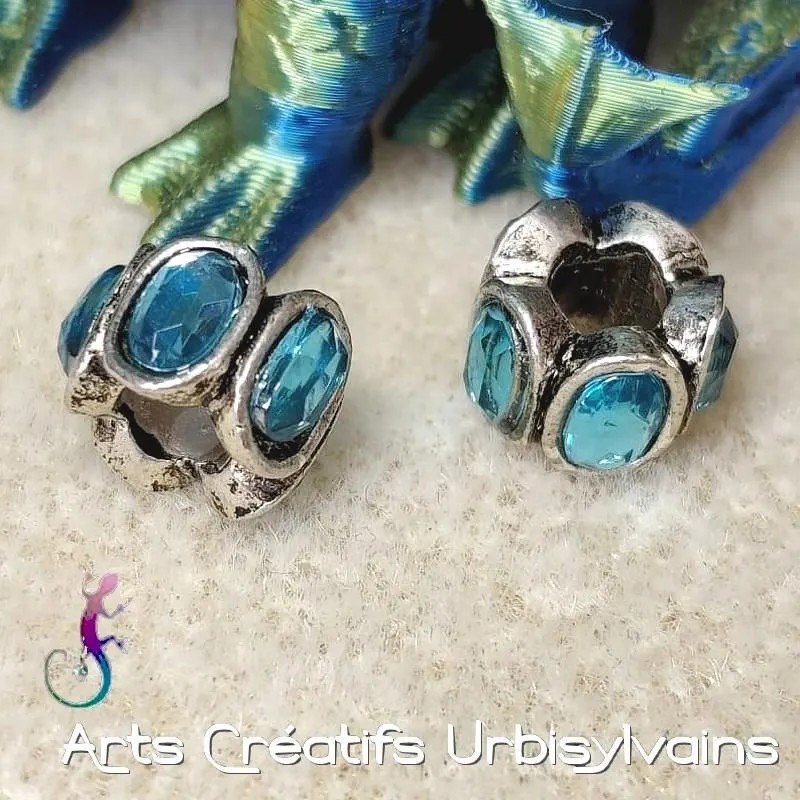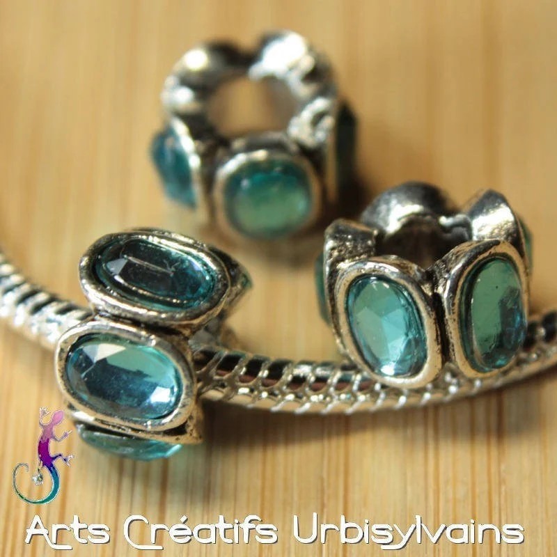 Perle en métal argent antique avec cristaux turquoises pour bracelet ou collier européen.