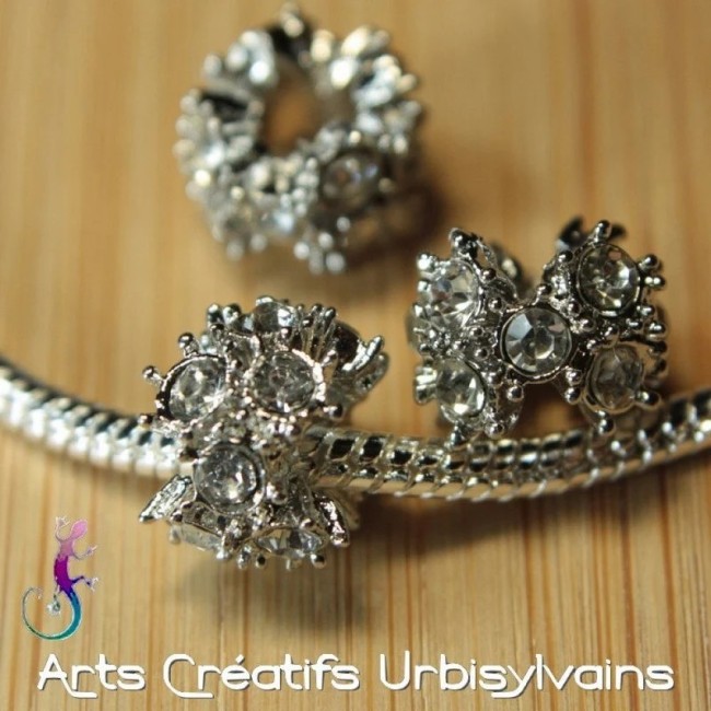 Perle en métal argenté et strass pour bracelet ou collier européen.