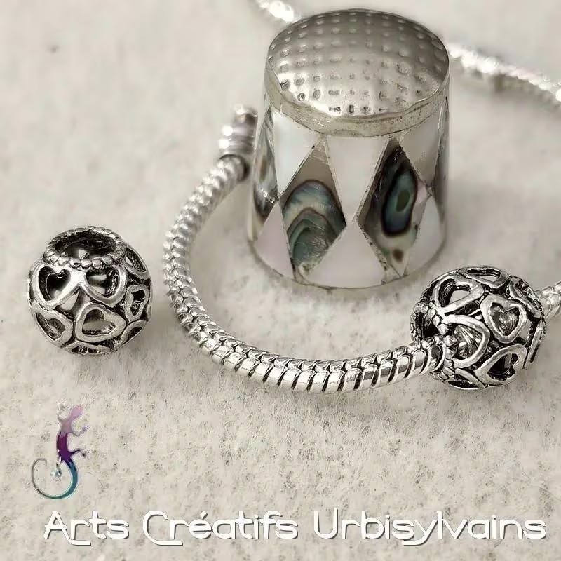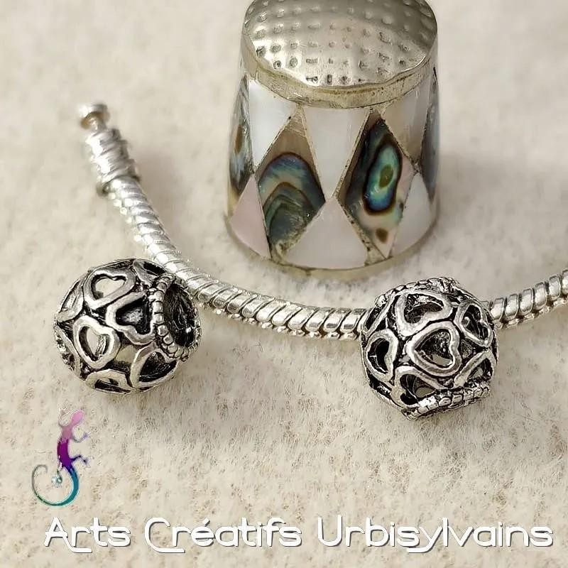 Perle ajourée en métal argenté avec des motifs en forme de coeurs pour bracelet ou collier européen.