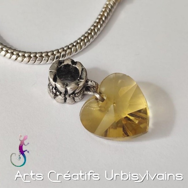 Bélière en métal argenté et coeur en verre facetté jaune pour bracelet ou collier européen.