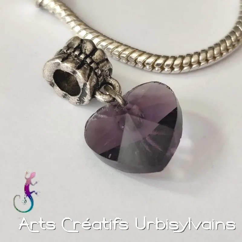 Pendentif charms avec bélière en métal argenté et coeur en verre violet pour bracelet ou collier européen.