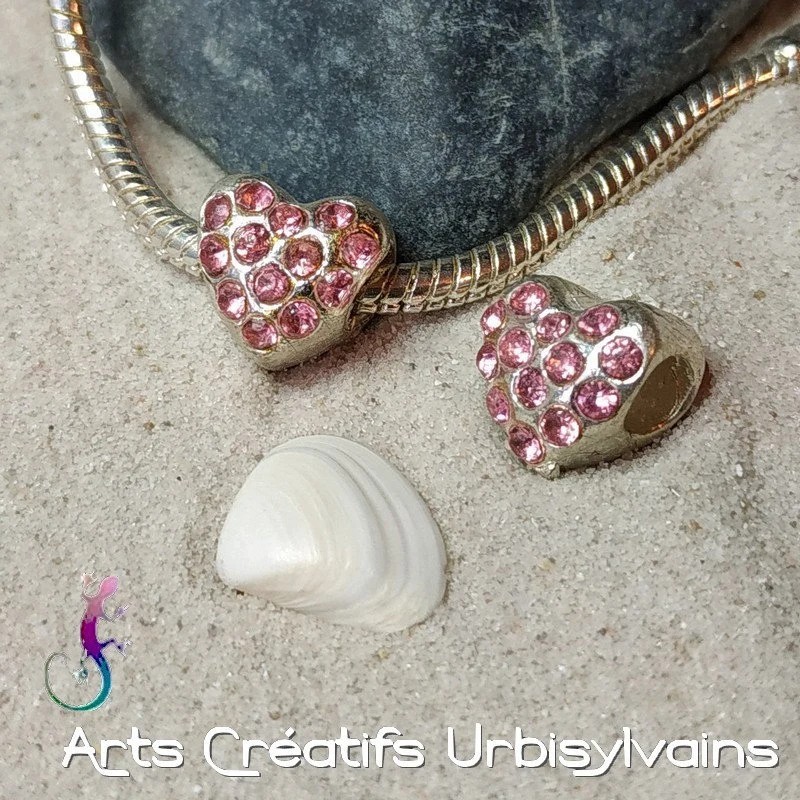 Perle en métal argenté en forme de cœur et strass roses pour bracelet ou collier européen.