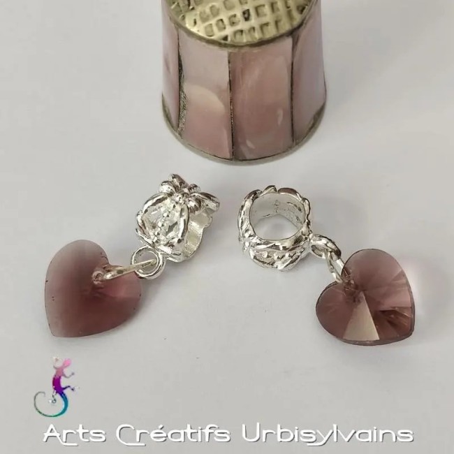 Bélière ciselée en métal plaqué argent et pendentif cœur en verre facetté vieux rose pour bracelet ou collier européen.