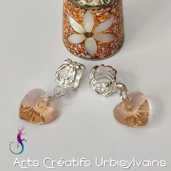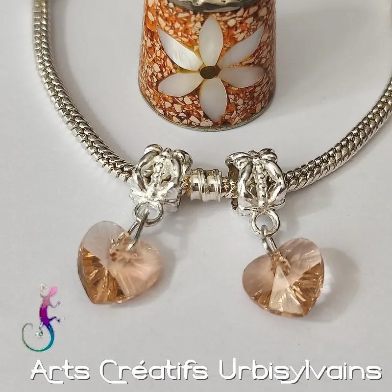 Bélière ciselée en métal argenté antique et cœur en verre facetté rose saumon pour bracelet ou collier européen.