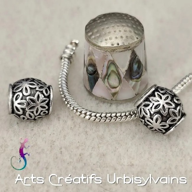 Perles rondes décor fleurs en métal argenté pour bracelet ou collier européen.