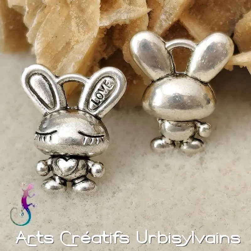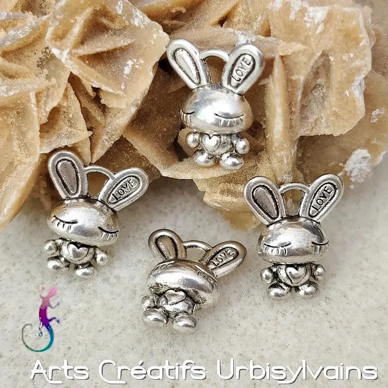 Breloques représentant un lapin en 3D en métal argenté antique. Le mot "Love" est gravé dans une oreille.