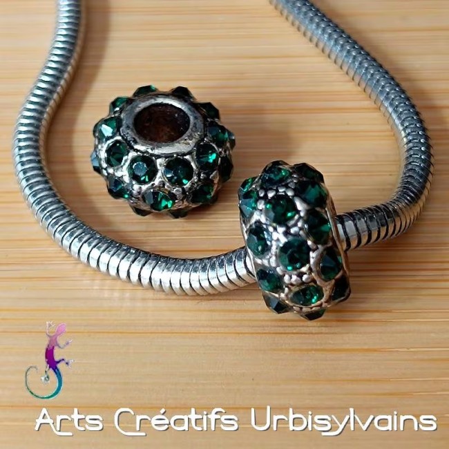 Lot de 2 perles en métal argenté avec strass vert pour bracelet ou collier européen