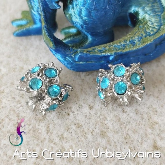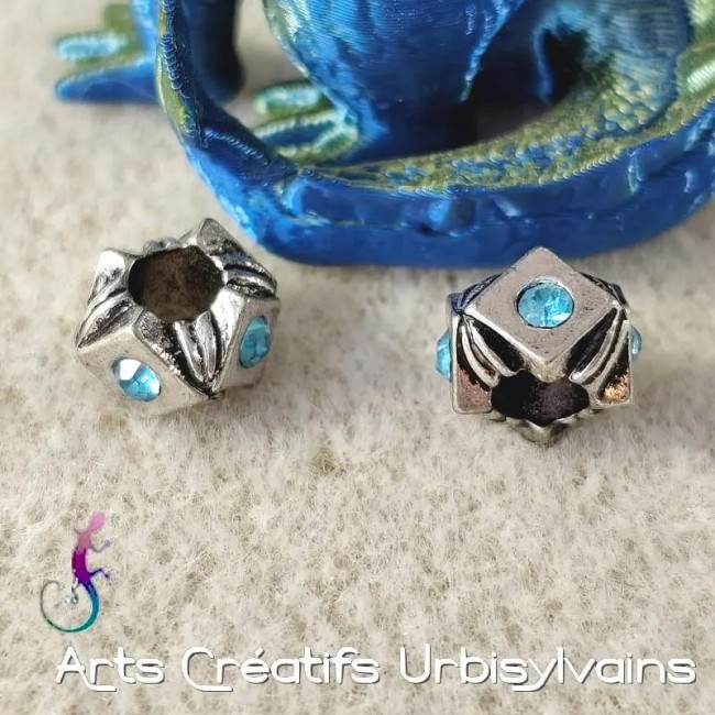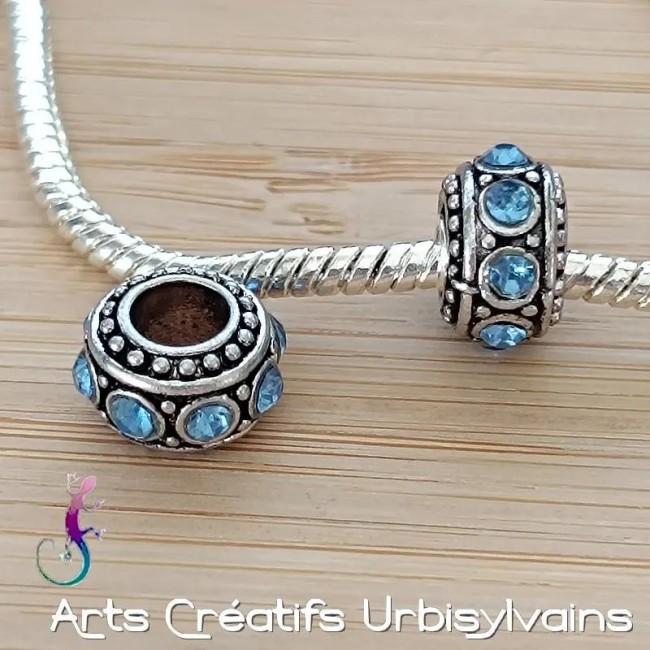 Lot de 2 perles ouvragées en métal argenté et strass bleu pour bracelet ou collier européen
